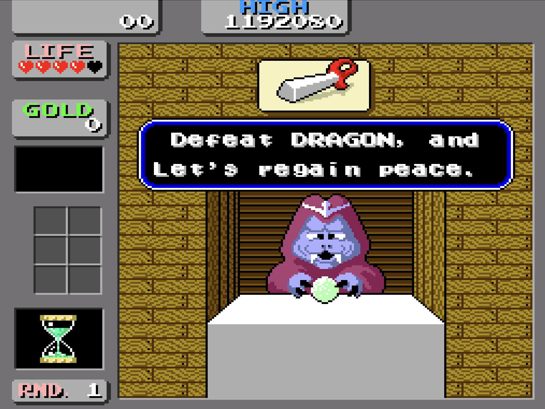 It was a platform game that had role-playing elements: defeating enemies gave you gold, and you could use the gold to buy items. These included better armor, shields, and boots that let you jump higher. You could also buy consumable items like fireballs, whirlwinds, thunderbolts, and bombs. You needed them to defeat some of the bosses at the end of each stage. Once you beat the boss, you got a key that opened a gate to the next level.